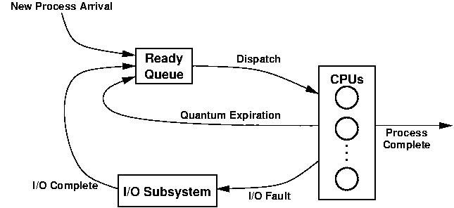 Processes enter the system and wait for their turn on a CPU. They run on a CPU, possibly being pre-empted by the scheduler or become blocked waiting for I/O service, until they have spent their entire service time on a CPU, at which point they leave the system.